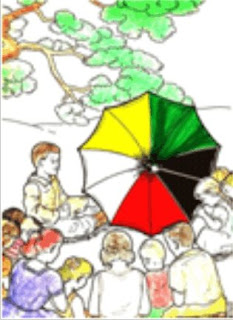 Finalmente chegaram a um lugar sombreado, debaixo de uma árvore bem grande, o menino colocou o enorme guarda-chuva no chão. E perguntou ele, as crianças que se aproximavam.