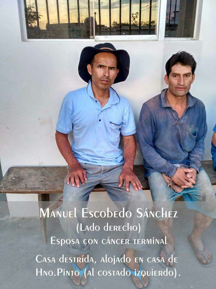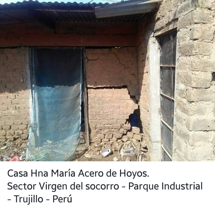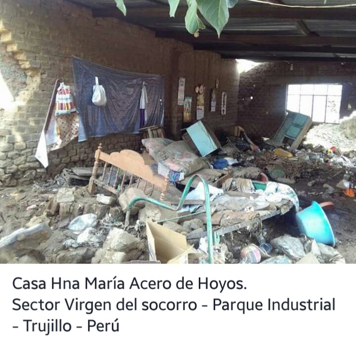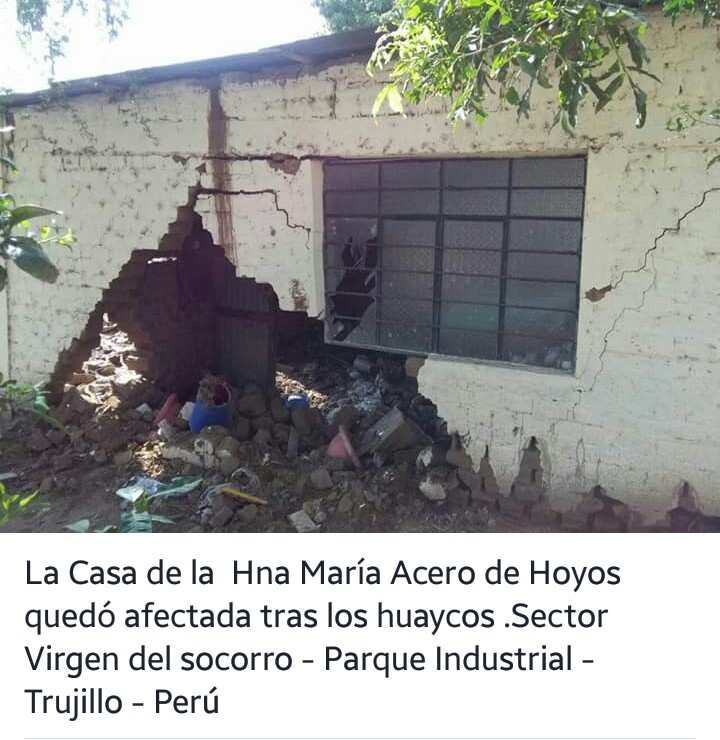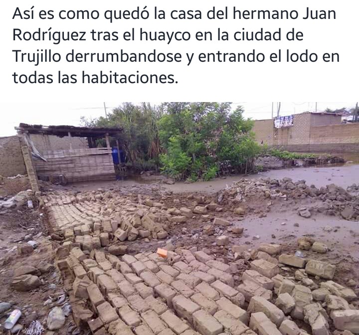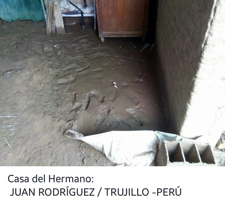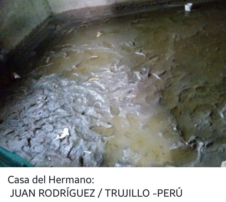 Trujillo - aqui 5 casas de irmãos foram destruídas e até o momento além destas, 29 famílias perderam de seus pertences e necessitam de ajuda imediata com alimento e água. Temos aqui um irmão que está sendo grandemente provado, o mesmo foi despedido de seu trabalho por conta da guarda do sábado e agora perdeu sua casa com todos os seus pertences, além de descobrir uma enfermidade para a qual terá grandes gastos para o tratamento.
